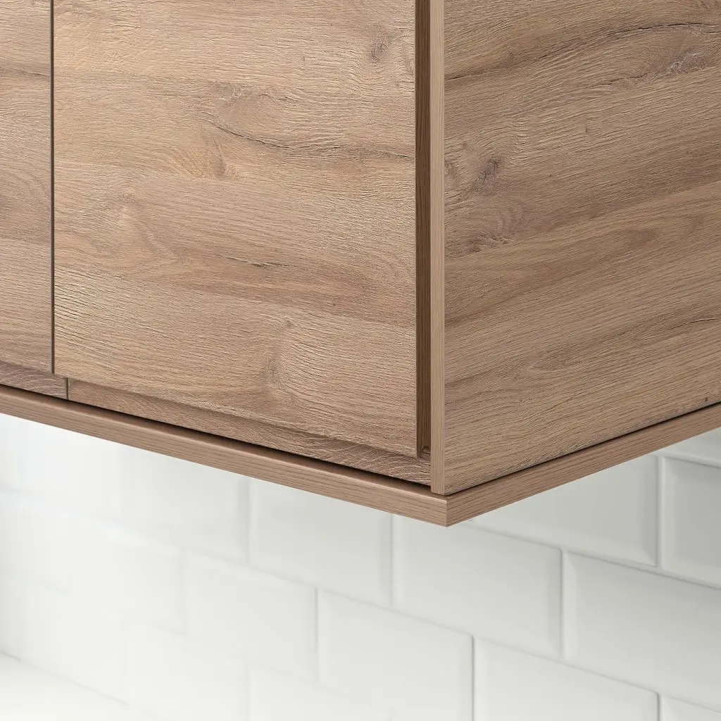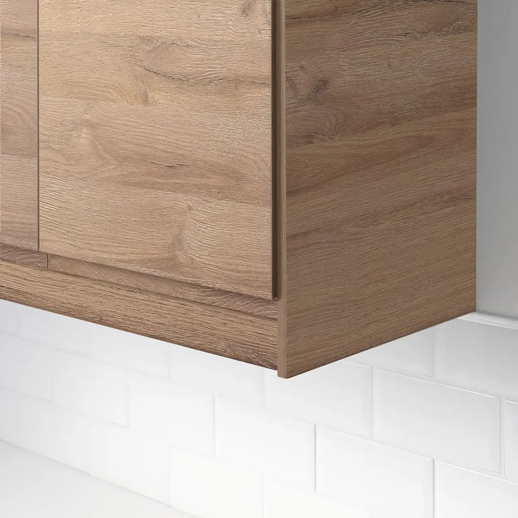 Можно использовать как декоративный карниз под навесными шкафами, чтобы спрятать подсветку, провода и розетки, а также установить на верхний край навесных и высоких шкафов.
