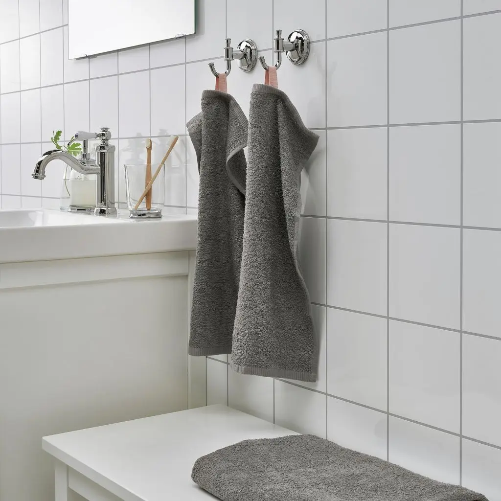Мягкое серое полотенце с петелькой для подвешивания контрастного цвета — практичной и декоративной деталью. Легкая ткань из смеси хлопка и вискозы прекрасно впитывает влагу.