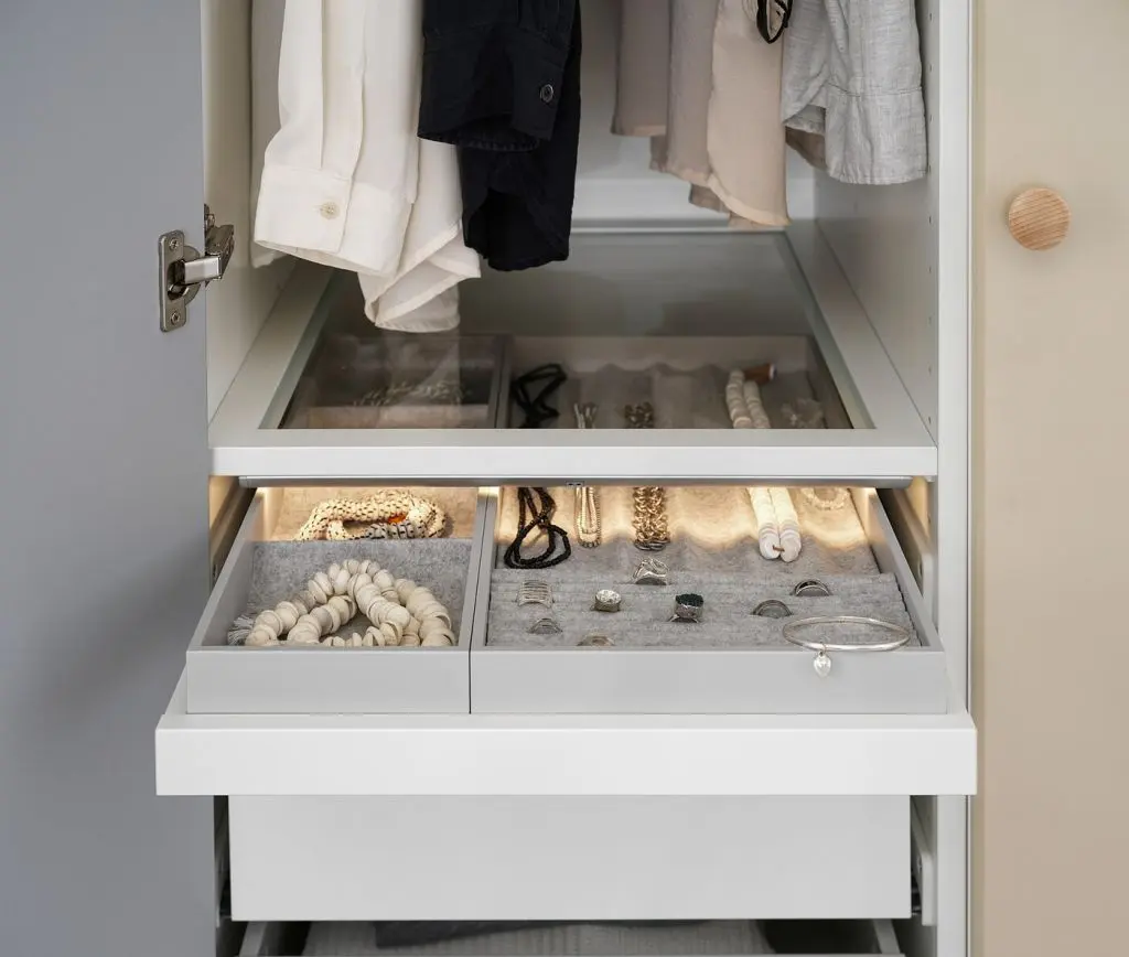 Вставка поможет содержать в порядке все ваши бусы, кольца, серьги и другие аксессуары, такие как очки и часы.В отделениях разного размера у каждого аксессуара будет свое место. И все вещи удобно доставать, когда вставка размещена так, чтобы большие отделения были расположены сзади.Мягкий материал обеспечивает аккуратное хранение ваших вещей.Выдвижная полка обеспечивает хороший обзор и удобный доступ к вашим вещам.Благодаря интегрированному доводчику задвигается медленно плавно и бесшумно.Можно дополнить стеклянной полкой КОМПЛИМЕНТ, чтобы обеспечить обзор содержимого выдвижной полки.Направляющие для выдвижной полки прилагаются.Дизайнер
