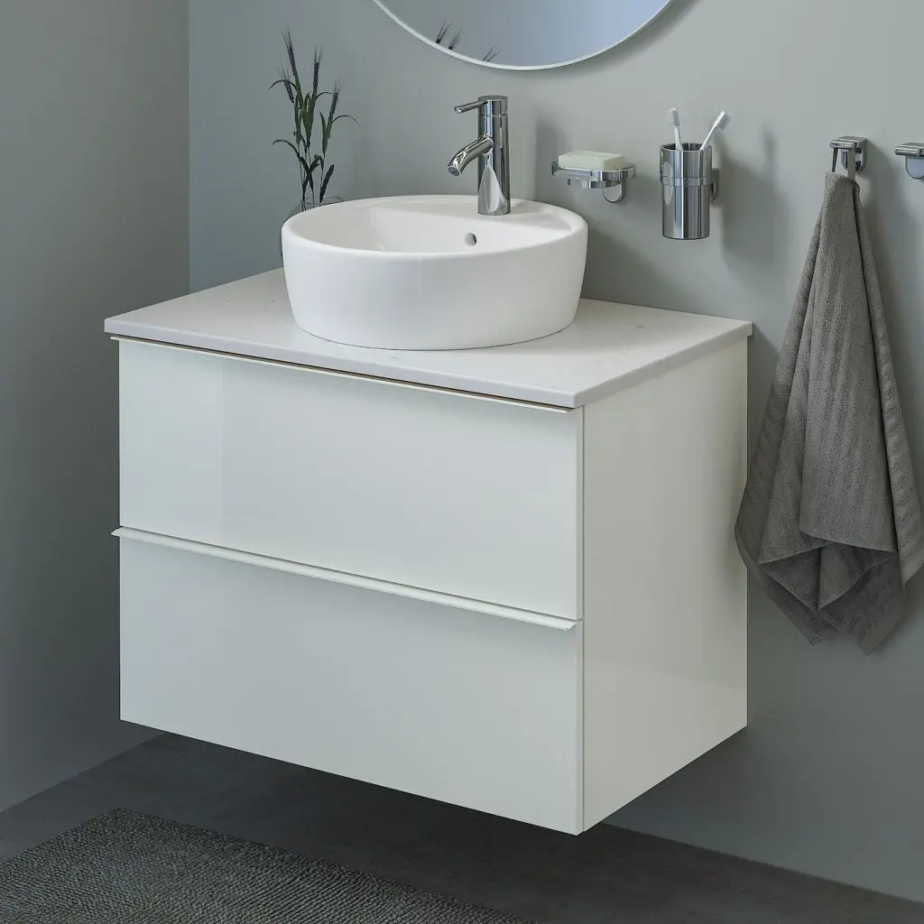 Отличное соотношение цены и качества и гарантия на срок не менее 10 лет ежедневного использования. Ознакомьтесь с условиями в гарантийной брошюре.Благодаря простому и лаконичному дизайну легко комбинировать с другой мебелью.Ящики защищены от повреждения водой благодаря продуманной технологии производства. Пленка наносится на поверхность ДСП таким образом, что не остается незащищенных кромок, в которые может проникнуть вода.Мыть пол теперь как никогда легко, ведь шкаф крепится к стене и ножки не будут мешать уборке.Ящики с плавным ходом и стопором полностью открываются, не выпадая из каркаса и обеспечивая отличный обзор содержимого.Специальный механизм обеспечивает плавное и бесшумное закрывание ящика, так что нет никакой опасности прищемить пальцы.В глубоком нижнем ящике удобно хранить полотенца и фен, а в верхнем ящике достаточно места для бутылочек с шампунем и гелем для душа и разных мелочей.Пространство ящиков можно использовать максимально эффективно, благодаря продуманному дизайну сифонЯщики легко собрать благодаря простой конструкции.Каждый раз открывая кран, вы экономите воду и энергию, так как аэратор предотвращает излишний расход воды.Ножки ГОДМОРГОН продаются отдельно.Обратите, пожалуйста, внимание, что для установки раковины в столешницу вам потребуются силиконовый уплотнитель и лобзик (продаются отдельно).Ручки прилагаются.Выпуск и сифон прилагаются.Смеситель и выпуск прилагаются.Раковина устойчива к воздействию большинства химикатов, за исключением сильных кислот и сильных щелочей.Эту мебель необходимо крепить к стене с помощью прилагаемого стенного крепежа.Если вы сомневаетесь в прочности стен в ванной, мы рекомендуем использовать ножки.Используйте прилагающийся шаблон для установки раковины на столешницу.Мойку в столешницу следует устанавливать через 2 часа после нанесения силиконового уплотнителя на столешницу, чтобы он успел затвердеть.Для сборки этой мебели требуются два человека.Убедитесь, что материалы, из которых сделаны стены ванной комнаты, выдержат вес мебели. Если у вас возникли сомнения по поводу установки, обратитесь к специалисту. Для разных стен требуются различные шурупы, дюбели, саморезы и т. п. (не прилагаются).