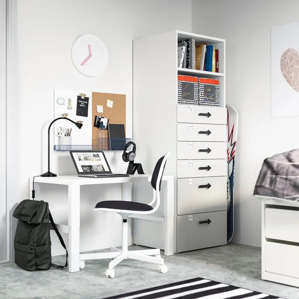 Открытые полки идеально подходят для хранения книг, а также демонстрации предметов коллекции, фотографий, собранных пазлов или поделок.В неглубоких ящиках найдется место для носков, белья и школьных принадлежностей, а в глубоких можно хранить крупные предметы, такие как спортивный инвентарь.Регулируемые ножки прилагаются, обеспечивают устойчивость даже на неровном полу.ВНИМАНИЕ! ОПАСНОСТЬ ОПРОКИДЫВАНИЯ! Незакрепленная мебель может опрокинуться. Эту мебель необходимо крепить к стене с помощью прилагаемого крепежа для предотвращения опрокидывания.Чтобы вам было легче находить нужное, а также приучить ребенка самостоятельно убирать и доставать свои вещи, можно дополнить окошками для этикетки ХЭНГИГ (продаются отдельно)Ручки продаются отдельно.Для разных стен требуются различные крепежные приспособления. Подберите подходящие для ваших стен шурупы, дюбели, саморезы и т. п. (не прилагаются).