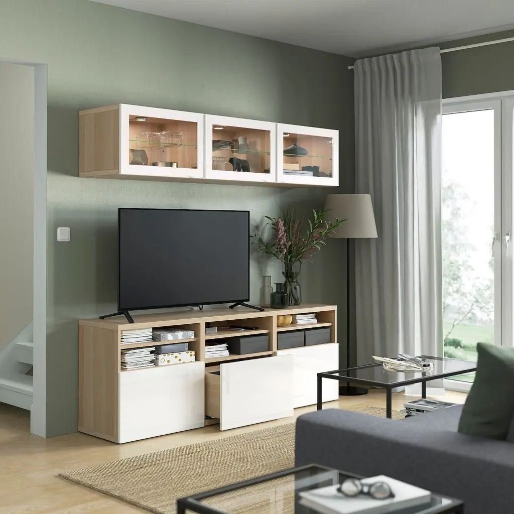 Благодаря нескольким отверстиям на задней панели тумбы под ТВ провода от телевизора и других устройств всегда будут под рукой, но не на виду.Специальное отверстие в верхней панели обеспечит удобное и компактное размещение проводов.Благодаря функции плавного закрывания ящик закрывается мягко и бесшумно.Съемные полки позволяют регулировать пространство.Настенные шкафчики позволяют эффективно использовать пространство над телевизором.Организуйте и оптимизируйте систему для хранения БЕСТО, используя подходящие коробки и вставки.Если вы выберете функцию плавного закрывания, рекомендуем дополнить фасады ручками, чтобы открывать ящики/шкафы было удобнее.Максимальная нагрузка на закрепленный на стене каркас зависит от материала стены.Для разных стен требуются различные крепежные приспособления. Подберите подходящие для ваших стен шурупы, дюбели, саморезы и т. п. (не прилагаются).Эту мебель необходимо крепить к стене с помощью прилагаемого стенного крепежа.Будьте осторожны при обращении с закаленным стеклом! Из-за поврежденных краев и царапин на поверхности стекло может внезапно разбиться.Чтобы создать единый интерьер во всем доме, фасады СЕЛЬСВИКЕН можно комбинировать с подходящими дверями ФАРДАЛЬ для гардероба ПАКС.