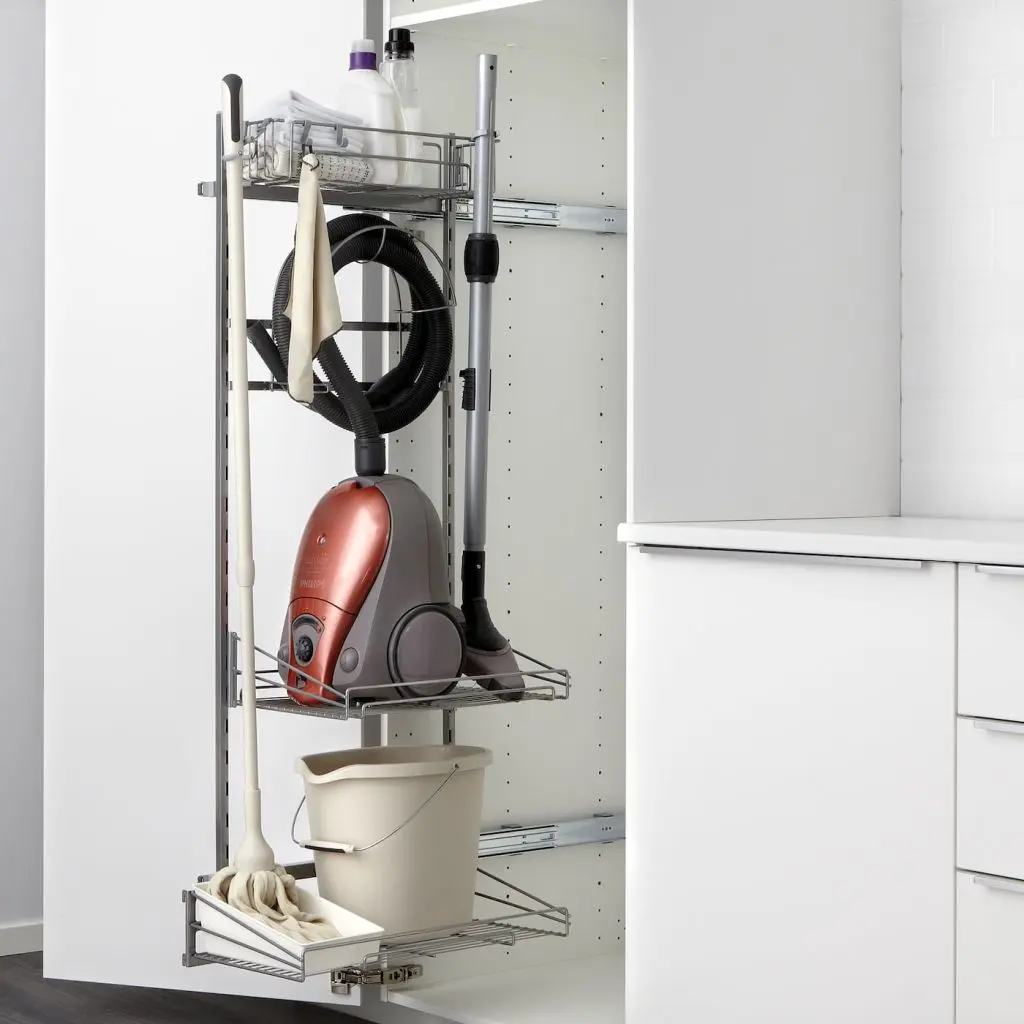 Выдвижные внутренние элементы для практичного хранения аксессуаров для уборки обеспечивают удобный обзор и легкий доступ к содержимому.