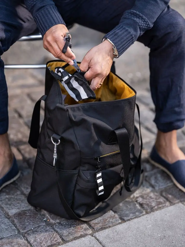 Легкая сумка, в которой можно взять с собой одежду, туалетные принадлежности, коврик для йоги и другие нужные вещи.Если вы собираетесь носить сумку в руке, плечевой ремень легко снять.Впереди есть три отделения на молнии для мобильного телефона, кошелька или других предметов, которые вы хотите иметь под рукой, а также съемный брелок для ключейВнутри есть одно отделение, которое закрывается на застежку-липучку, и одна съемная дополнительная сумочка, которую легко доставать, т. к. она тоже крепится с помощью застежки-липучки.Сзади есть два открытых отделения с подкладкой в черно-белую полоску, где можно хранить вещи, которые всегда должны быть рукой.В боковых карманах поместятся бутылка с водой и зонтик.Брелок в полоску легко снимается — его можно использовать отдельно или прикрепить к другой сумке.Благодаря маленьким «ножкам» на дне сумка дольше не будет пачкаться.Дизайнер