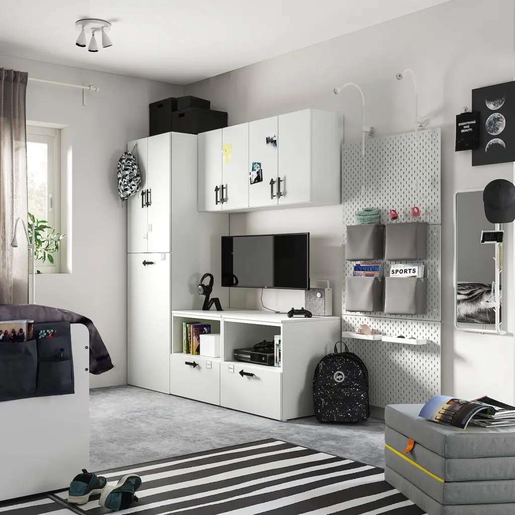 В нижней части выдвижного модуля можно хранить все, что нужно быстро убирать с глаз долой.Благодаря крючкам изнутри и снаружи ребенку будет гораздо проще развешивать одежду, рюкзаки и другие вещи, которые обычно просто валяются на полу.Двери с петлями для плавного закрывания всегда закрываются бесшумно — даже в разгар жаркого спора.ВНИМАНИЕ! ОПАСНОСТЬ ОПРОКИДЫВАНИЯ! Незакрепленная мебель может опрокинуться. Эту мебель необходимо крепить к стене с помощью прилагаемого крепежа для предотвращения опрокидывания.Для разных стен требуются различные крепежные приспособления. Подберите подходящие для ваших стен шурупы, дюбели, саморезы и т. п. (не прилагаются).Можно дополнить ручками.Ручки продаются отдельно.
