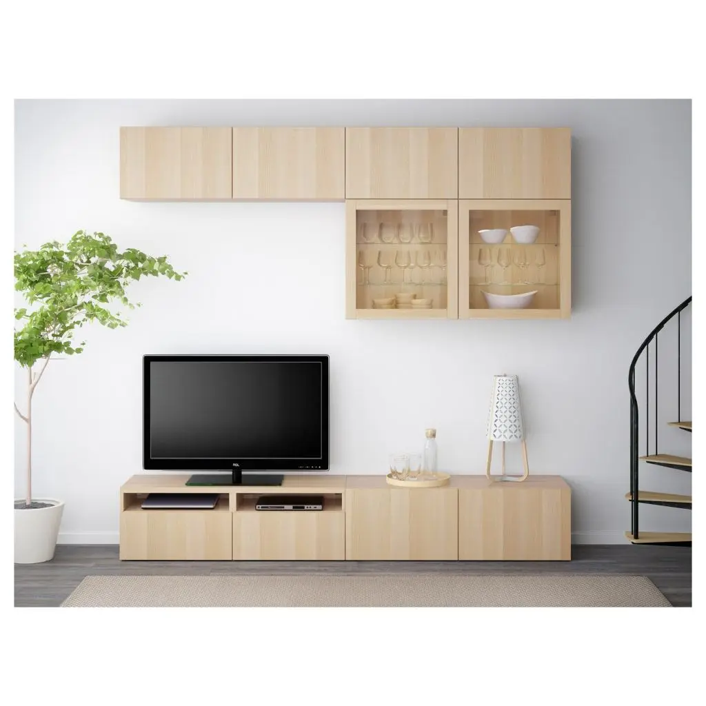 Благодаря нескольким отверстиям на задней панели тумбы под ТВ провода от телевизора и других устройств всегда будут под рукой, но не на виду.Специальное отверстие в верхней панели обеспечит удобное и компактное размещение проводов.Благодаря интегрированному нажимному механизму ящики и дверцы открываются легким нажатием.Ящики со встроенным нажимным механизмом открываются легким нажатием.Настенные шкафчики позволяют эффективно использовать пространство над телевизором.Ящики обеспечат более упорядоченное хранение ваших вещей. А полки за дверцами предоставят еще больше места.Съемные полки позволяют регулировать пространство.Организуйте и оптимизируйте систему для хранения БЕСТО, используя подходящие коробки и вставки.Эту мебель необходимо крепить к стене с помощью прилагаемого стенного крепежа.Максимальная нагрузка на закрепленный на стене каркас зависит от материала стены.Для разных стен требуются различные крепежные приспособления. Подберите подходящие для ваших стен шурупы, дюбели, саморезы и т. п. (не прилагаются).Для функционирования нажимного механизма необходимо пространство между каркасом и фронтальной панелью ящика, чтобы ящик открывался нажатием. Небольшой зазор необходим для обеспечения этой функции и не является недостатком товара.