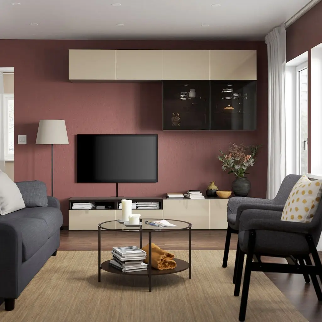 Благодаря нескольким отверстиям на задней панели тумбы под ТВ провода от телевизора и других устройств всегда будут под рукой, но не на виду.Специальное отверстие в верхней панели обеспечит удобное и компактное размещение проводов.Благодаря интегрированному нажимному механизму ящики и дверцы открываются легким нажатием.Ящики со встроенным нажимным механизмом открываются легким нажатием.Настенные шкафчики позволяют эффективно использовать пространство над телевизором.Ящики обеспечат более упорядоченное хранение ваших вещей. А полки за дверцами предоставят еще больше места.Съемные полки позволяют регулировать пространство.Организуйте и оптимизируйте систему для хранения БЕСТО, используя подходящие коробки и вставки.Эту мебель необходимо крепить к стене с помощью прилагаемого стенного крепежа.Максимальная нагрузка на закрепленный на стене каркас зависит от материала стены.Для разных стен требуются различные крепежные приспособления. Подберите подходящие для ваших стен шурупы, дюбели, саморезы и т. п. (не прилагаются).Для функционирования нажимного механизма необходимо пространство между каркасом и фронтальной панелью ящика, чтобы ящик открывался нажатием. Небольшой зазор необходим для обеспечения этой функции и не является недостатком товара.