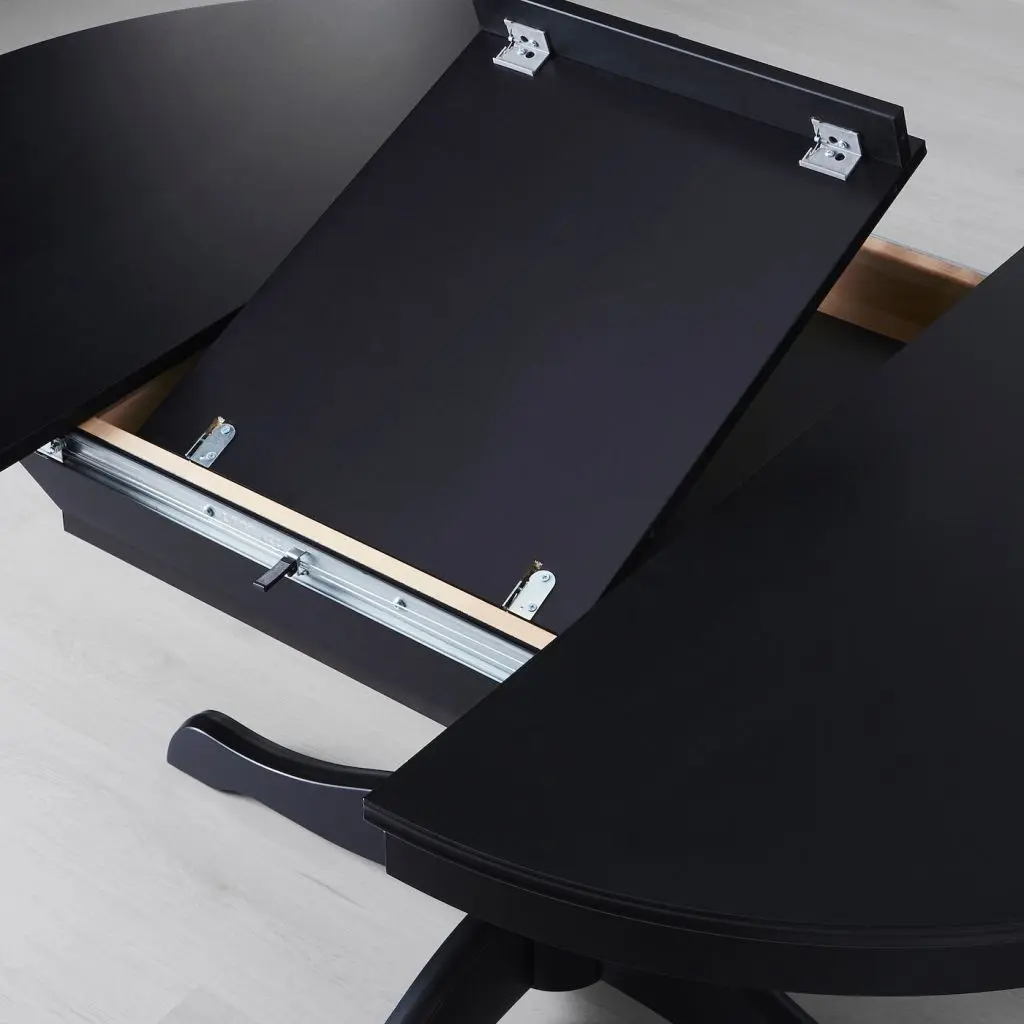 Размер стола легко изменить. Благодаря вкладной доске, хранящейся под столешницей, за столом могут сидеть от 4 до 6 человек.