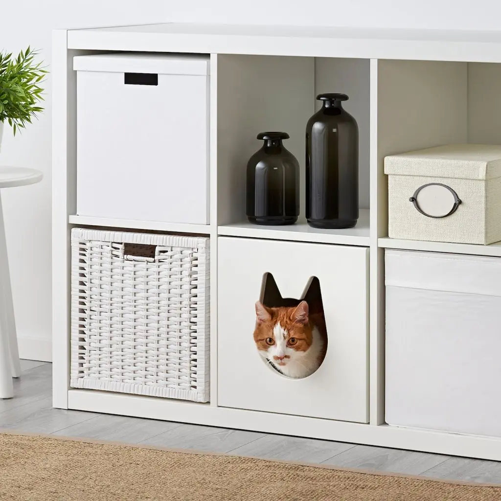 Благодаря небольшому окошку кошка будет чувствовать себя в безопасности.Благодаря лицевой отделке задней панели можно использовать в открытом стеллаже, разделяющем комнату.По размеру подходит для стеллажа КАЛЛАКС.