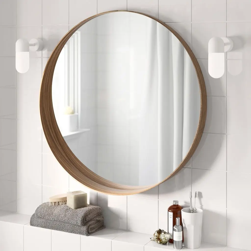 Плавная форма и использование шпона для рамы придают зеркалу выразительный облик. Нижняя часть рамы образует полочку, на которую можно положить мобильный телефон или кошелек.