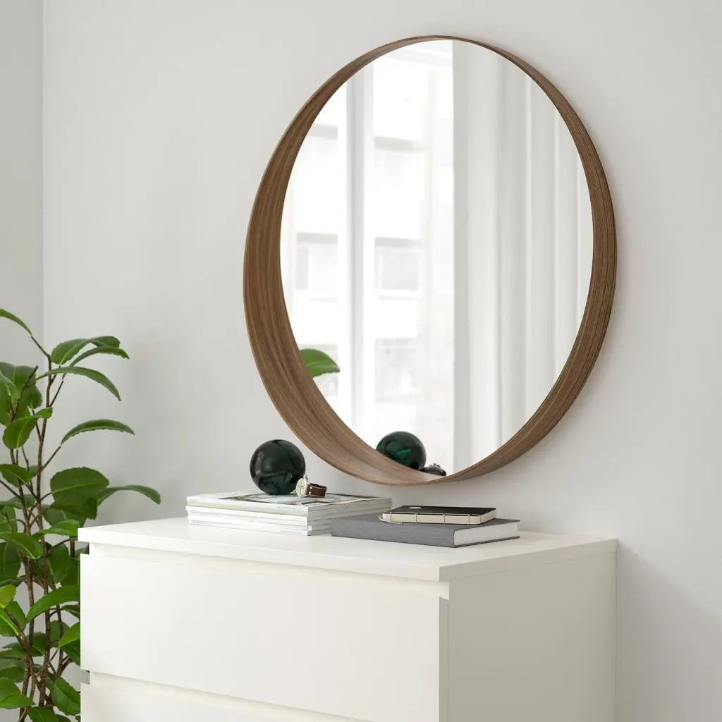 Специальная пленка защитит от осколков, если стекло разобьется.Более широкая в нижней части зеркала рама образует полочку, на которую можно положить косметику, кошелек или телефон.Подходит для использования в большинстве помещений. Протестировано и одобрено для использования в ванной.Шпон грецкого ореха с характерным рисунком поверхности придает каждому предмету мебели уникальность.Шпон грецкого ореха – прочный натуральный материал. Дополнительную прочность поверхности обеспечивает защитное покрытие лаком.Не используйте раму в качестве полочки для свечей.Повесьте зеркало в соответствии с инструкцией по сборке, используя крепления на обратной стороне. Используйте шурупы, подходящие для материала стен в вашем доме, продаются отдельно.Можно дополнить другой мебелью серии СТОКГОЛЬМ.Дизайнер