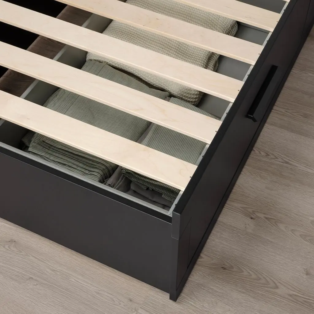 Днем на кушетке удобно сидеть, а ночью она легко превратится в односпальную или двуспальную кровать. В двух вместительных ящиках можно хранить одеяла, подушки и постельное белье. Отличное решение, особенно, если в комнате немного места.