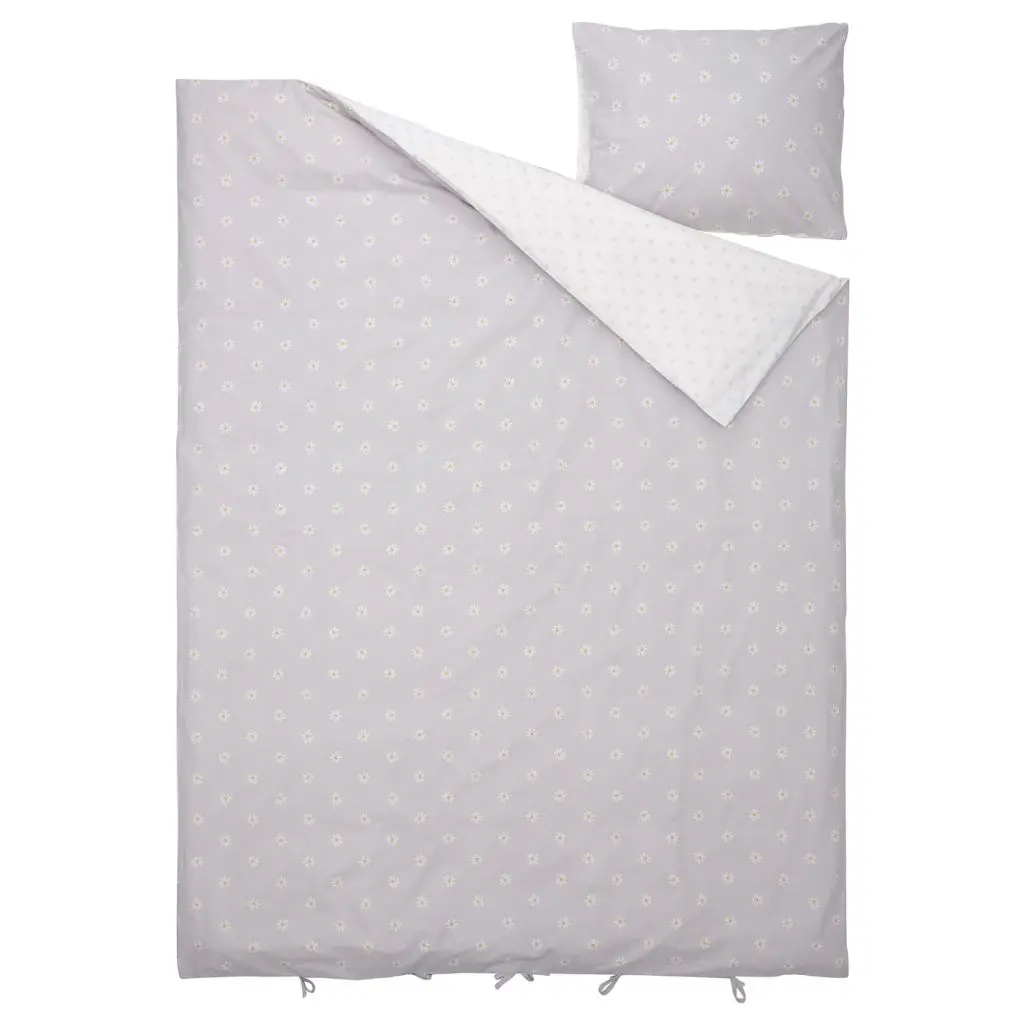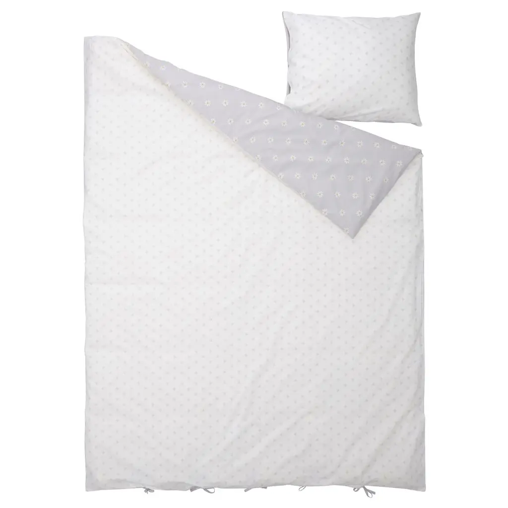 Одна сторона постельного белья серая, другая — белая. С обеих сторон ткань украшает орнамент в виде ромашек разного размера.Мягкое и комфортное для кожи ребенка перкалевое постельное белье все соткано из волшебных снов.Ребенок будет спокойно спать всю ночь, т. к. хлопок прекрасно впитывает влагу и способствует ее быстрому испарению, что помогает поддерживать в постели комфортный микроклимат.Пододеяльник с декоративными завязками по нижнему краю.Мы знаем, что детям требуется особая забота. Этот товар тщательно протестирован и одобрен для детей. Здесь нет фталатов, а также других веществ и химикатов, которые могут быть вредны для ребенка.Рекомендовано для детей от 3 лет.Количество нитей на кв. дюйм: 190.Чем выше количество нитей на квадратный дюйм, тем прочнее и плотнее ткань.В комлект входит: 1 пододеяльник (150×200 см) и 1 наволочка (50×70 см).Дизайнер