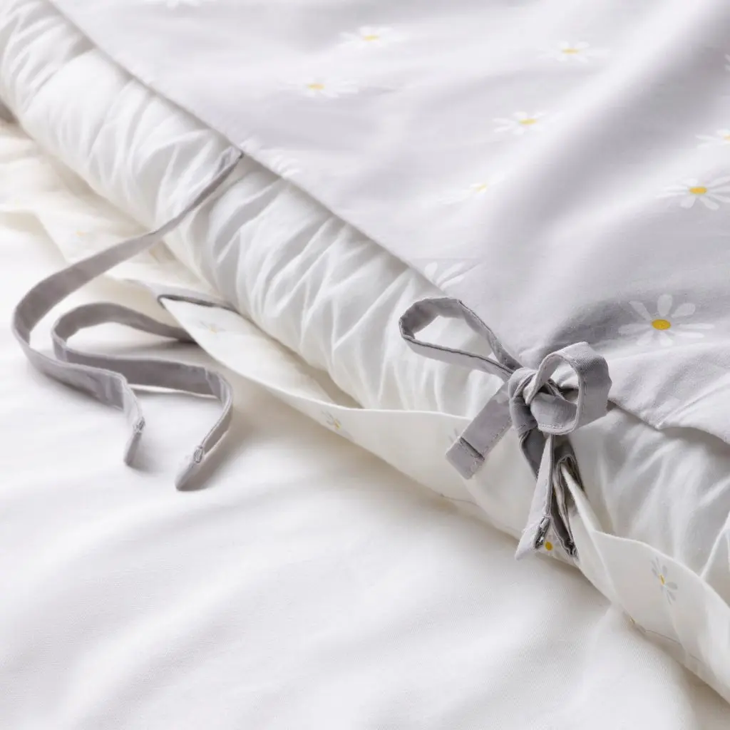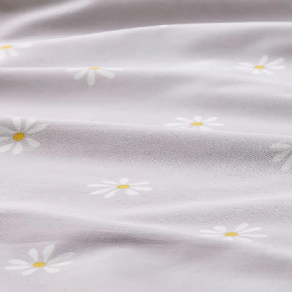 Ромашки… Существует ли какая-то более летняя тема? Этот серо-белый пододеяльник с обеих сторон украшен ромашками, а его ткань приятно холодит кожу, т. к. изготовлена из плотной хлопковой перкали.
