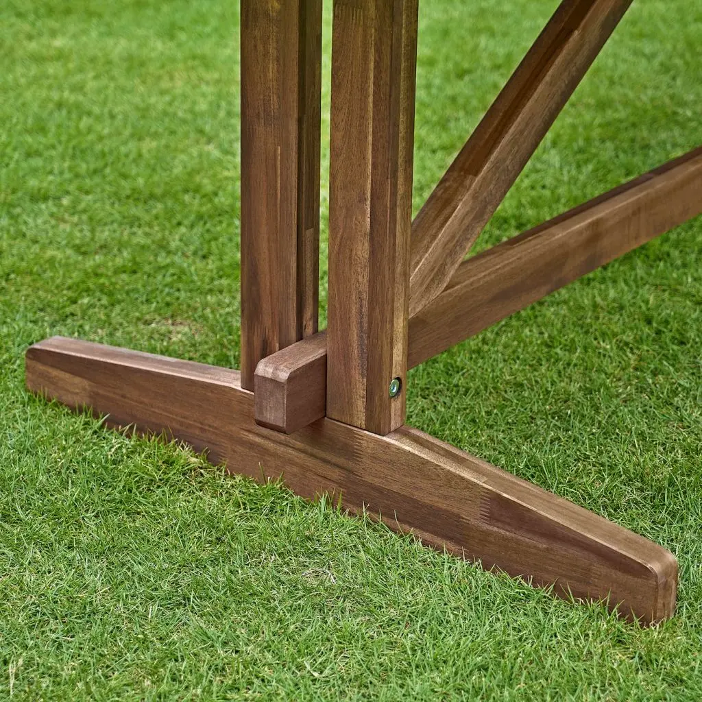 Планки столешницы образуют узор «елочка». Они расположены с небольшими промежутками, в которые может стекать дождевая вода, но не упадут столовые приборы.