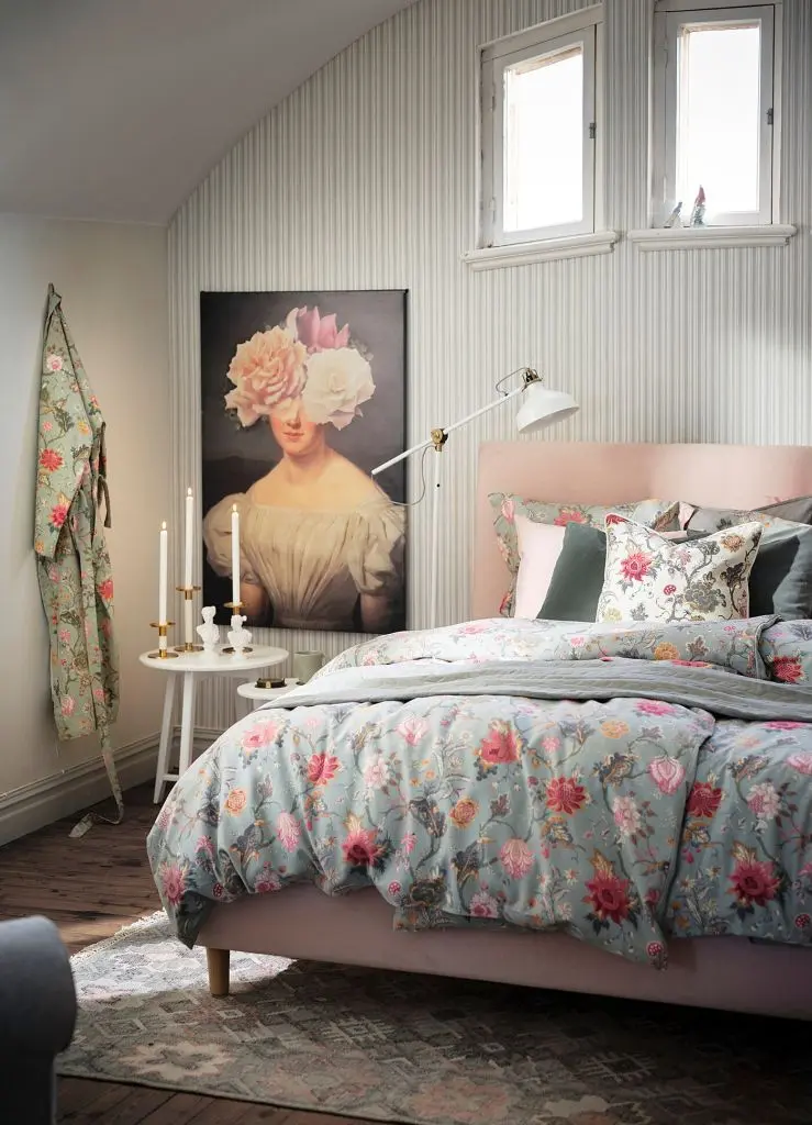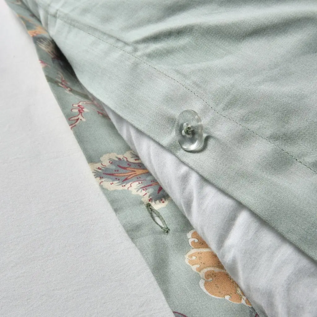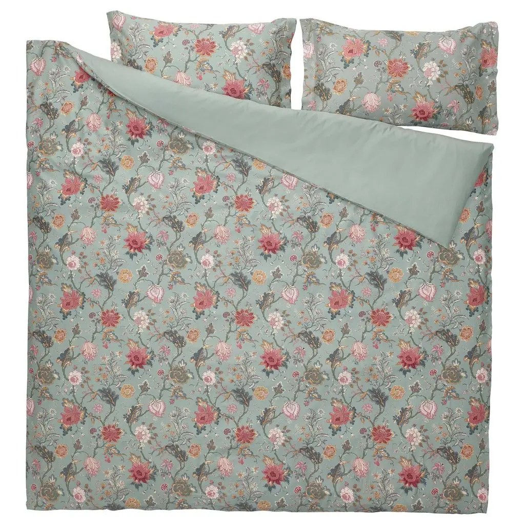 На одной стороне — цветочный узор, на другой — однотонная зеленая поверхность. Легкая, дышащая ткань из смеси хлопка и вискозы с атласным переплетением имеет легкий блеск, который привносит изящество в привычный интерьер спальни.